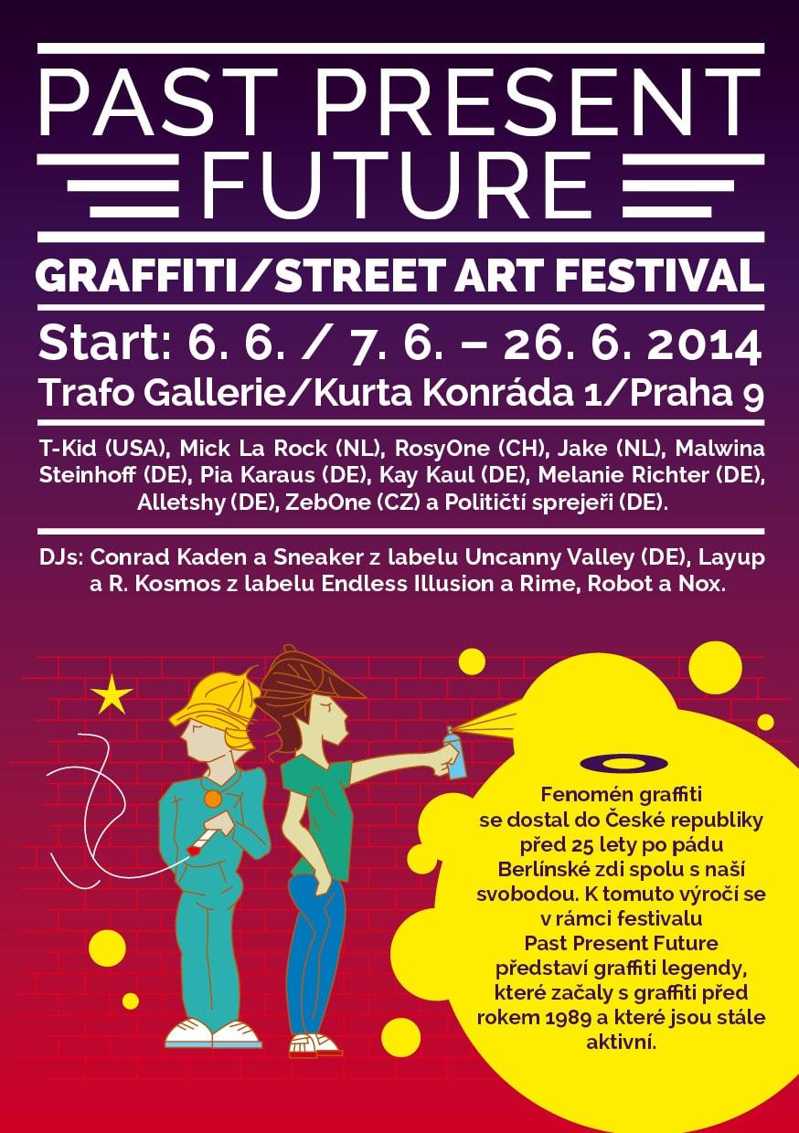 Press release: The graffiti phenomenon arrived in the Czech Republic 25 years ago, along with our freedom after the fall of the Berlin Wall. To commemorate this anniversary, the Past Present Future festival will showcase graffiti legends who started their work before 1989 and are still active today. The program includes exhibitions, murals around the city, and the premiere of the documentary Style Wars 2. The accompanying program will feature graffiti workshops, discussions, a Fashion Fever bazaar, and an alternative Prague tour with a street artist: T-Kid (USA), Mick La Rock (NL), RosyOne (CH), Jake (NL), Political Sprayers (DE), ZebOne (CZ) and others. Curator by Sany.